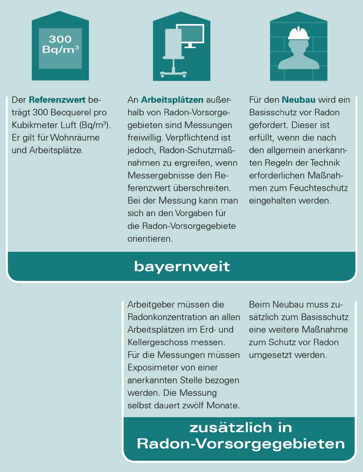 Da Radon überall natürlich vorkommt, sehen das Strahlenschutzgesetz und die Strahlenschutzverordnung des Bundes deutschlandweit einen Basisschutz vor Radon vor. Abhängig von den geologischen Gegebenheiten ist die Wahrscheinlichkeit in einigen Gebieten größer, dass hier Radonkonzentrationen über dem gesetzlich festgelegten Referenzwert von 300 Becquerel pro Kubikmeter Luft auftreten. Diese Gebiete werden als Radon-Vorsorgegebiete festgelegt. Hier gelten zusätzliche Pflichten und somit ein zusätzlicher Schutz für die Bevölkerung. Die Radonkonzentration kann aber auch außerhalb von Radon-Vorsorgegebieten erhöht sein, auch wenn die Wahrscheinlichkeit außerhalb dieser Gebiete geringer ist. Allgemein gilt: Gewissheit schafft nur eine Messung. Wird der Referenzwert überschritten, können oftmals einfache Maßnahmen, wie regelmäßiges Lüften, Abhilfe schaffen.