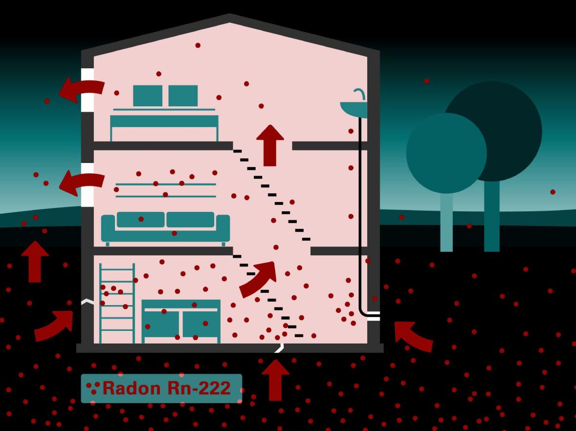 Radon ist ein radioaktives Edelgas. Es entsteht überall natürlich im Boden. Gelangt Radon beispielsweise durch Fugen, Risse, Spalten oder entlang von Rohrdurchführungen ins Gebäudeinnere, kann es sich hier ansammeln. Bei längeren Aufenthalten in Räumen mit erhöhter Radonkonzentration kann die Entstehung von Lungenkrebs begünstigt werden.